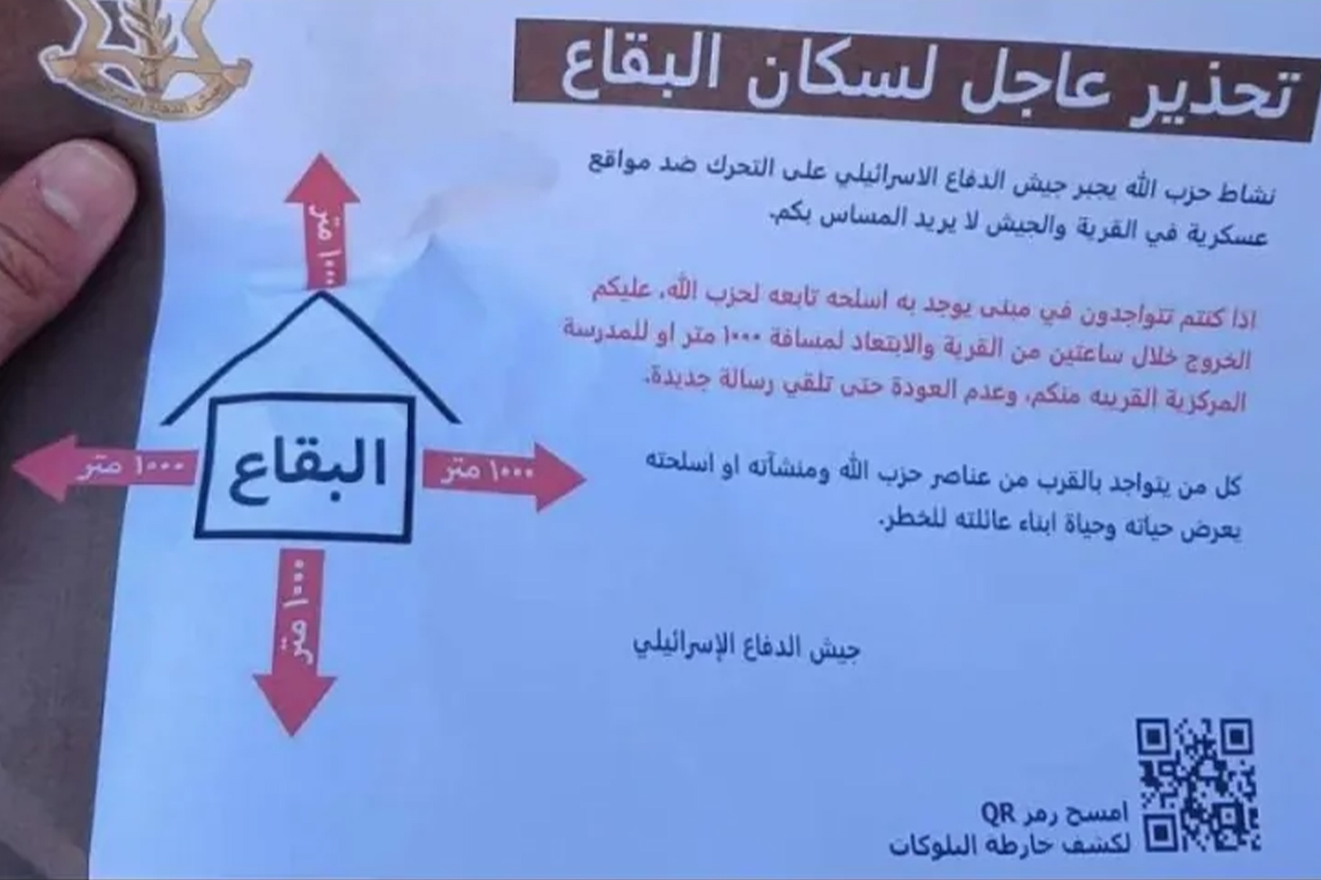 حذر حزب الله اللبناني اليوم الثلاثاء سكان سهل البقاع شرقي لبنان من منشورات تُسقطها إسرائيل تحتوي على رمز تعريفي “الباركود” وصفه بالخطير جدا. وأشار المكتب