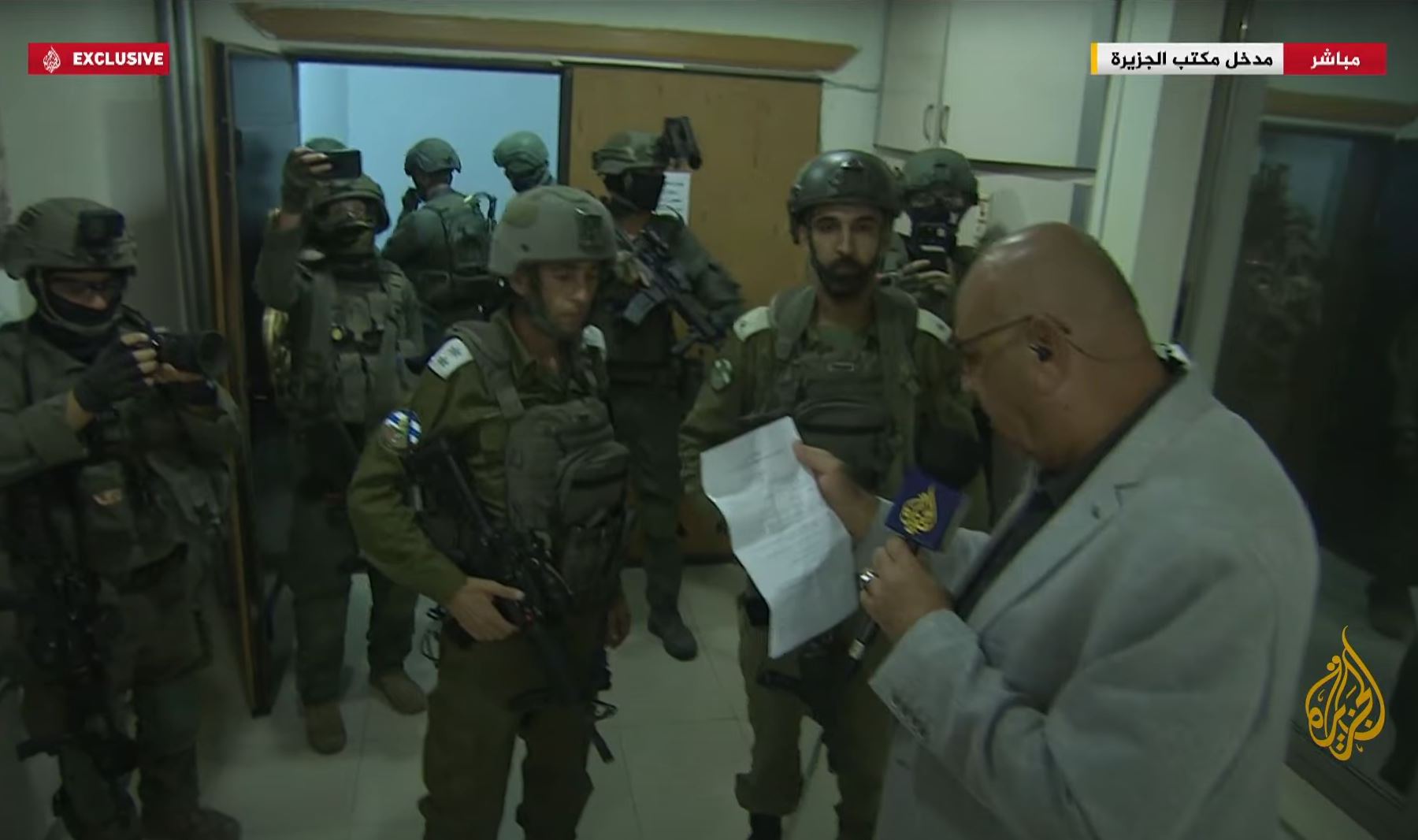 اقتحمت قوات الاحتلال الإسرائيلي مكتب الجزيرة برام الله وأمرت بإغلاقه 45 يوما بموجب أمر عسكري، ثم قامت بمصادرة كافة الأجهزة والوثائق في المكتب ومنعت العاملين
