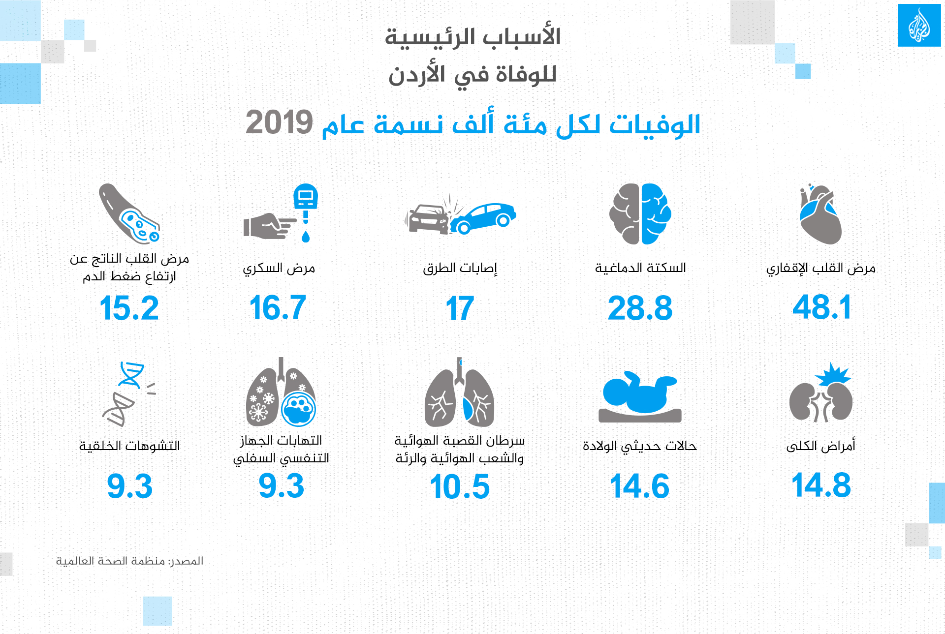 نقدم في “الجزيرة صحة” تغطية معمقة حول واقع القطاع الصحي والرعاية الطبية في الأردن، سبرنا فيها المنظومة الصحية الأردنية، وواقع الأمراض المزمنة والتدخين والسمنة، وقضايا