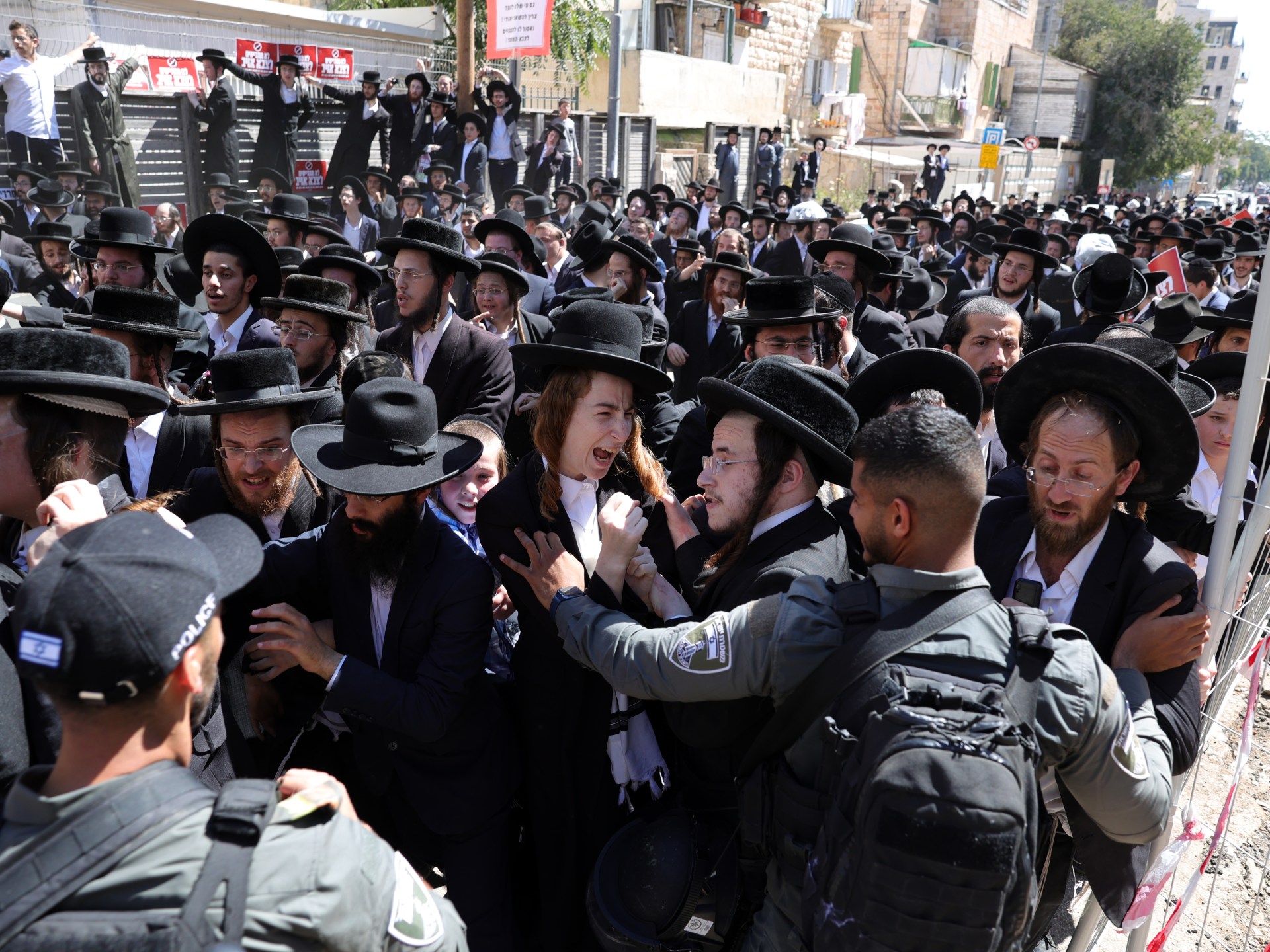نشبت صدامات بين متظاهرين من المتزمتين اليهود المعروفين بـ”الحريديم” وعناصر الشرطة الإسرائيلية اليوم الأربعاء بالقرب من مكتب للتجنيد في القدس خلال مظاهرة احتجاجية شارك فيها