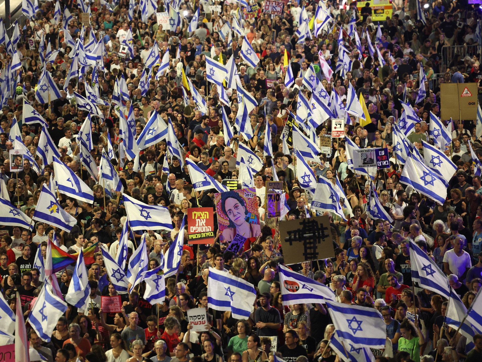 تظاهر عشرات الآلاف من الإسرائيليين في وسط مدينة تل أبيب للمطالبة باجراء انتخابات مبكرة ورحيل حكومة رئيس الوزراء بنيامين نتنياهو وإبرام صفقة تبادل للأسرى. ورفع