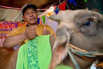 داخل “صالون تدليك الأبقار” بجانب طريق سريع في جاكرتا، يضرب سوماروان بيديه ساقي بقرة بنية من أجل تحضيرها على أفضل وجه قبل تقديمها كأضحية في