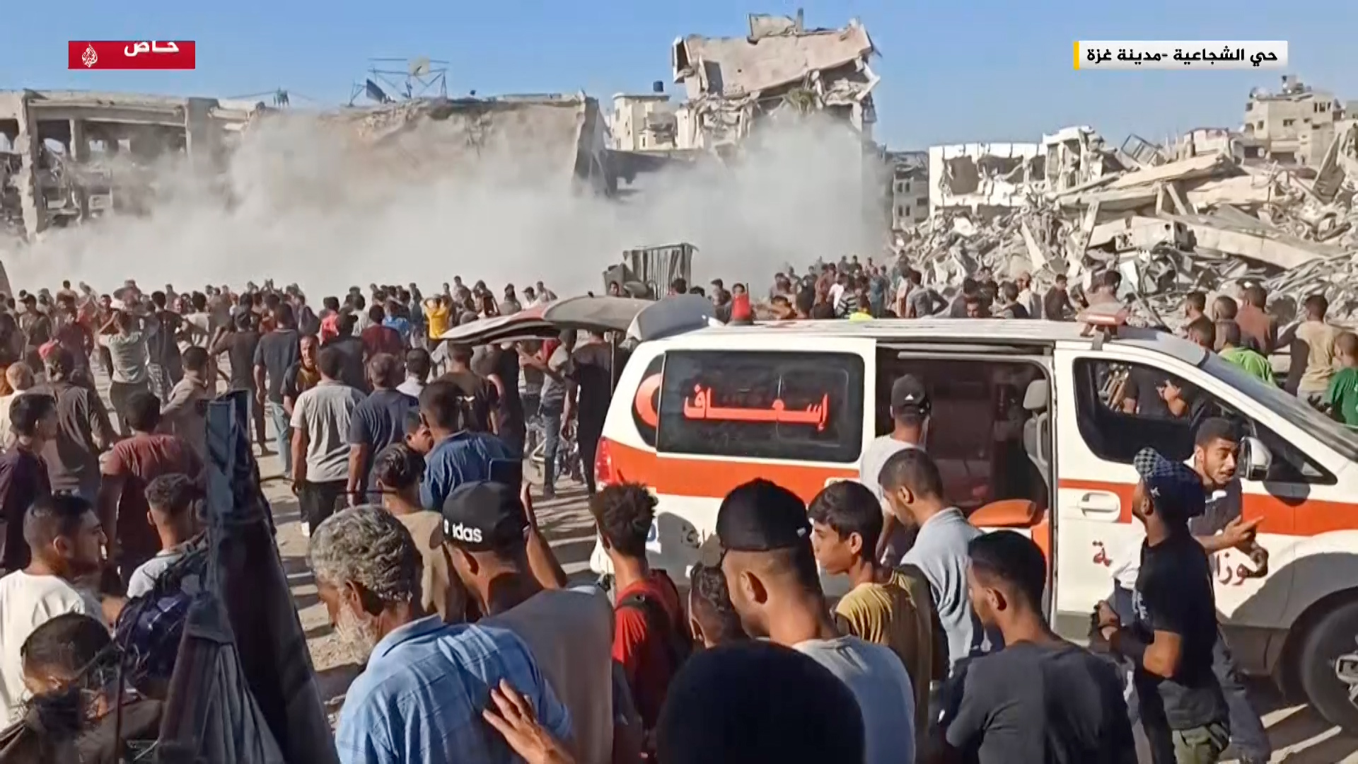 استشهد 15 فلسطينيا على الأقل وأصيب آخرون بجروح خطيرة في قصف لقوات الاحتلال الإسرائيلي استهدف مركزا يؤوي نازحين في حي الشجاعية بغزة. وتظهر اللقطات اللحظات