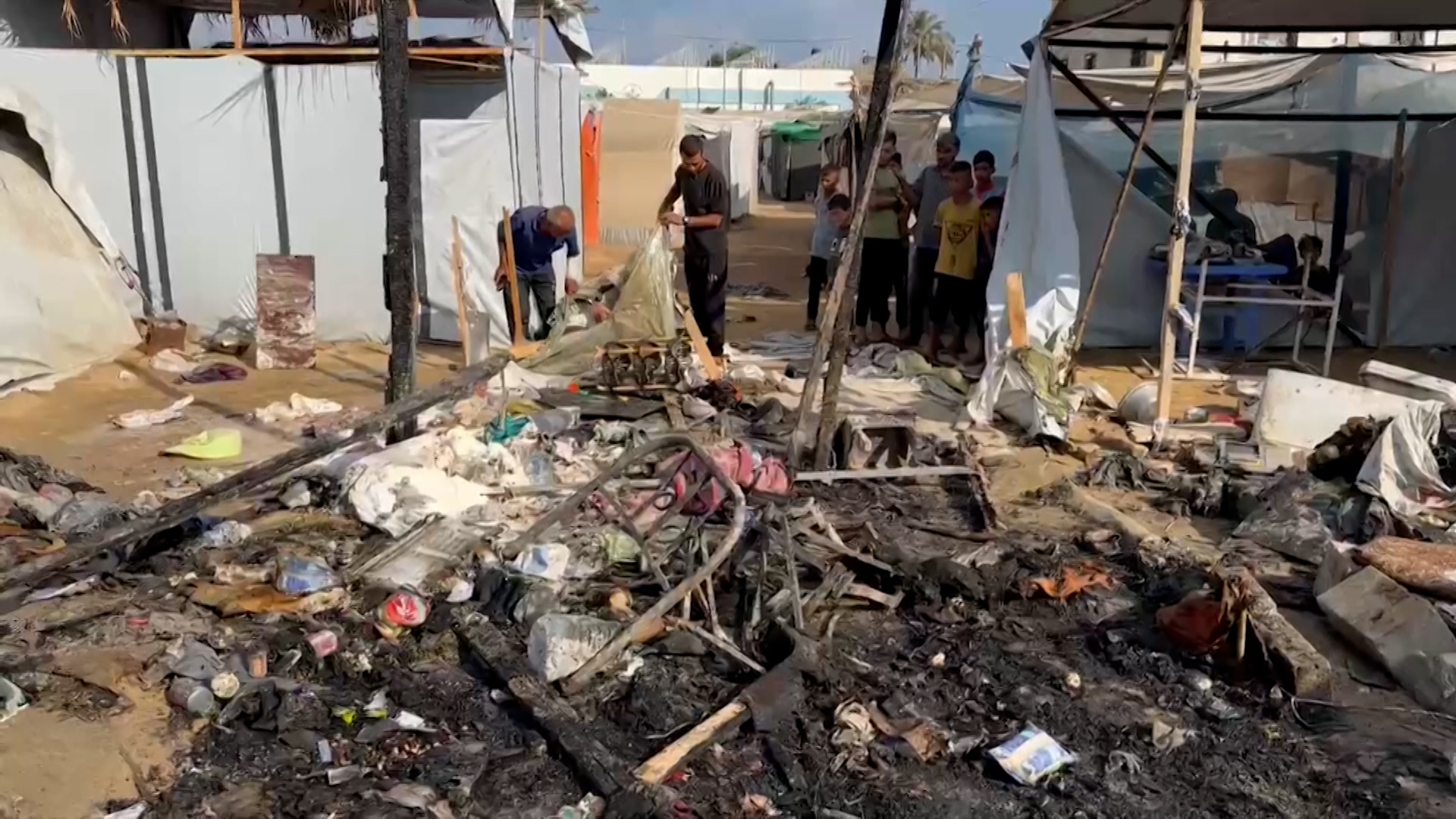 استشهد 7 أشخاص على الأقل وأصيب آخرون إثر قصف إسرائيلي استهدف خيمة تؤوي نازحين في مستشفى شهداء الأقصى. مراسل الجزيرة أشرف أبو عمرة رصد الدمار