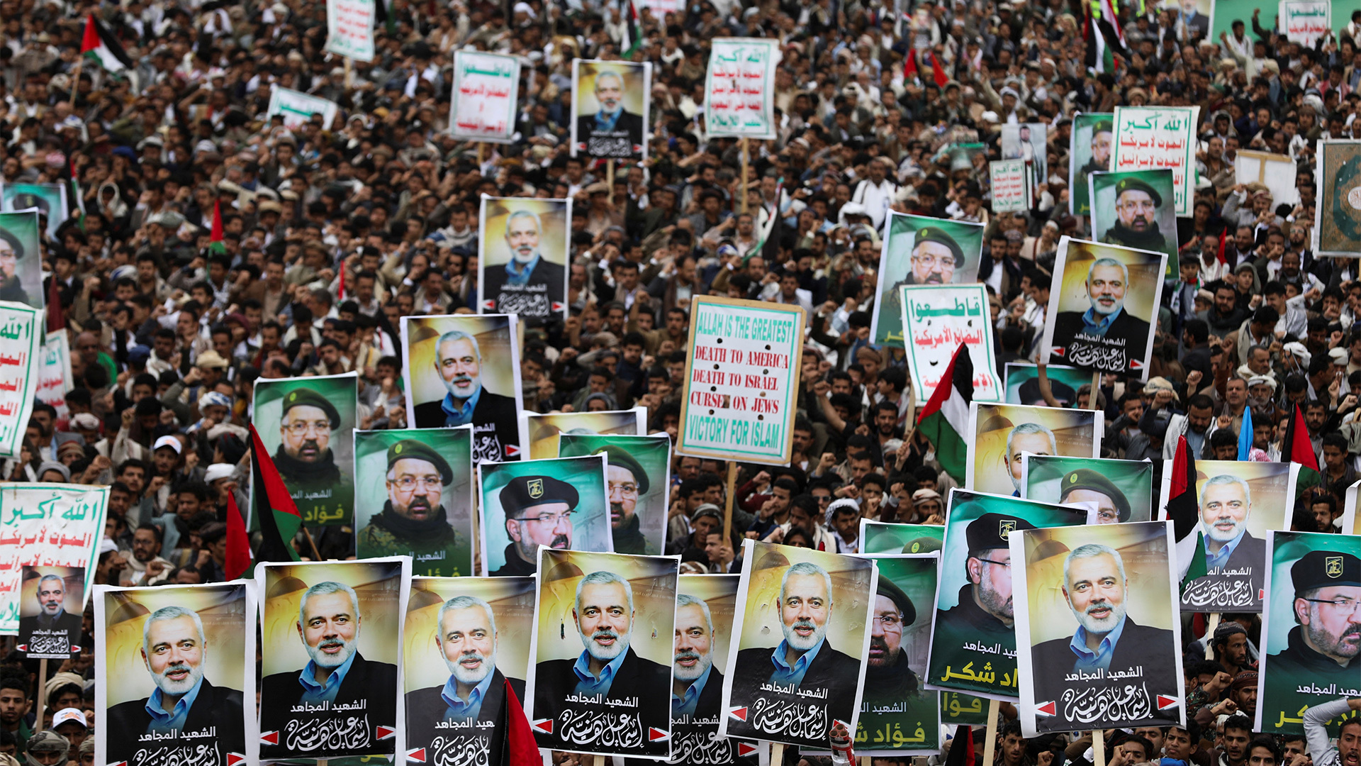 شهدت العاصمة اليمنية صنعاء مسيرة للتنديد باغتيال رئيس المكتب السياسي لحركة حماس إسماعيل هنية والقيادي في حزب الله فؤاد شكر، وطالب المتظاهرون محور المقاومة بالرد