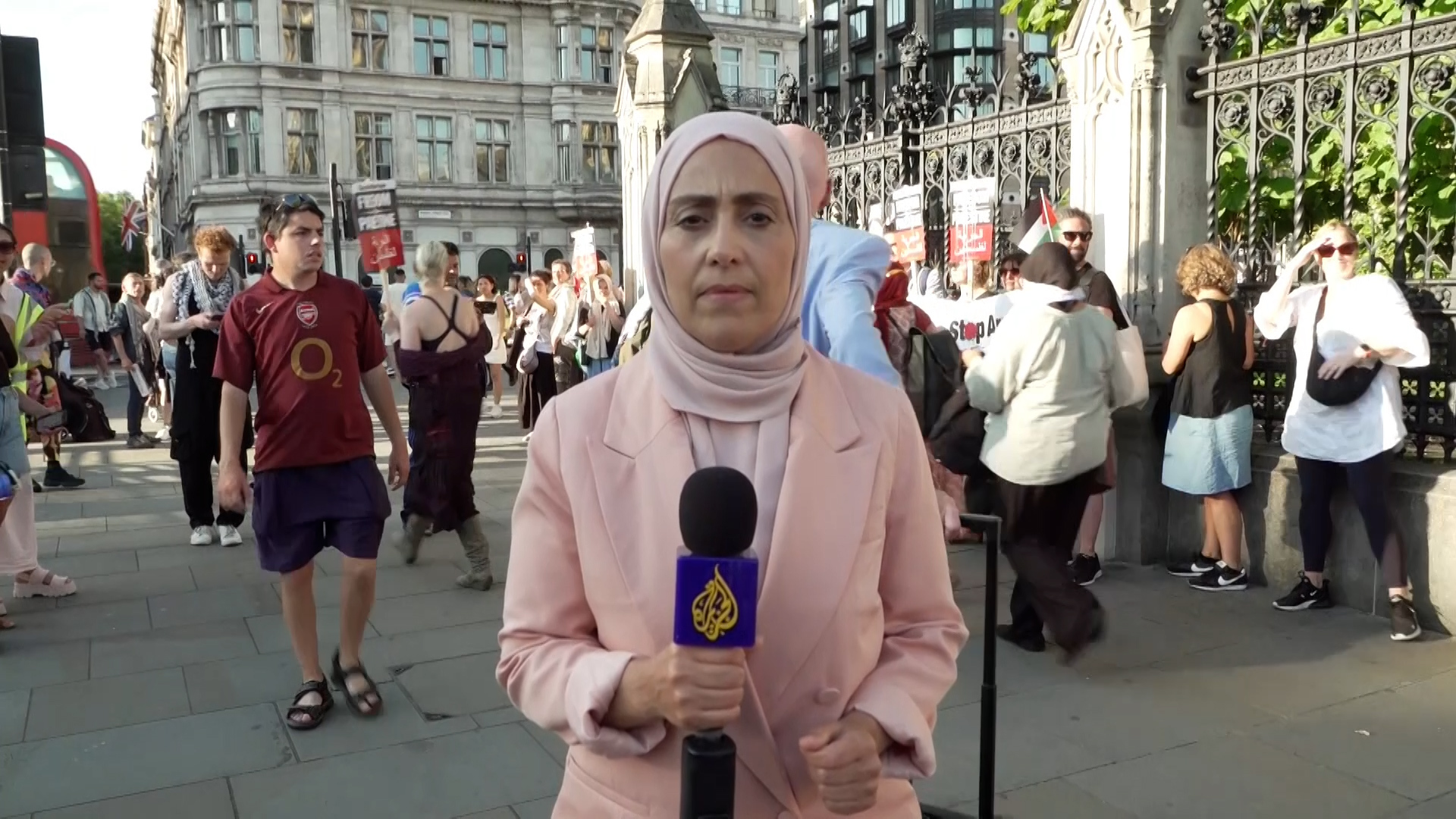 وتأتي المظاهرة دعما للفلسطينيين وللتنديد بمجازر الاحتلال الإسرائيلي المتواصلة بحق المدنيين في قطاع غزة. المصدر: الجزيرة