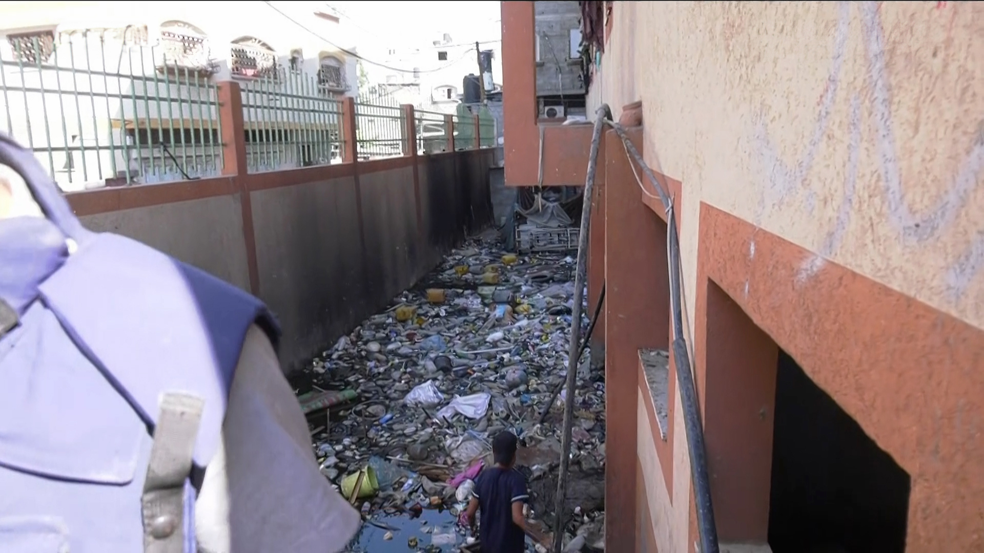رصدت كاميرا الجزيرة تكدس النفايات وانتشار مياه الصرف الصحي في أماكن نزوح المواطنين في قطاع غزة وبالتحديد مستشفى اليمن السعيد، الذي يضم عددا كبيرا من
