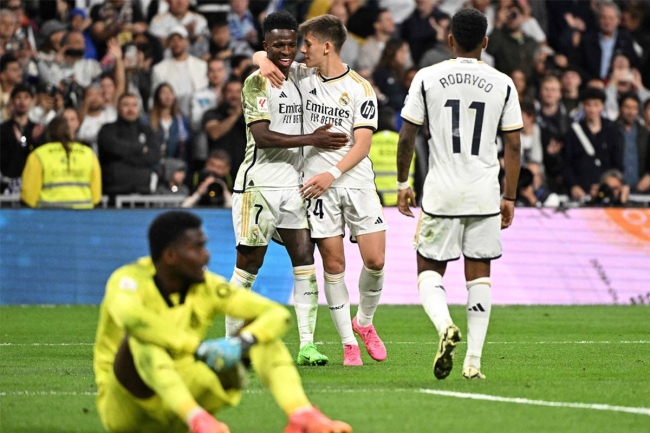أكرم ريال مدريد، بطل الدوري الإسباني لكرة القدم، وفادة ألافيس بخماسية نظيفة، بينها ثنائية لنجمه البرازيلي فينيسيوس جونيور، أمس الثلاثاء، في المرحلة السادسة والثلاثين. والفوز