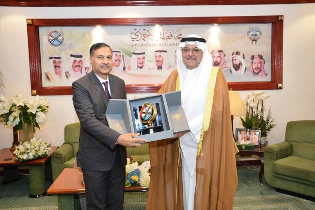 استقبل محافظ الأحمدي الشيخ حمد الحمود، في مكتبه بالديوان العام للمحافظة، سفير الهند لدى الكويت د. ادرش سويكا، حيث جرى التعارف، إضافة إلى بحث العلاقات