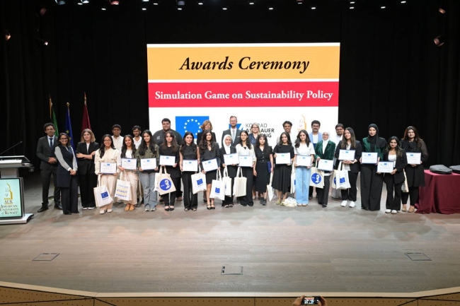 وسط مشاركة عدد من طلبة الجامعة الأميركية في الكويت (AUK)، استضافت الجامعة، أخيراً، لعبة محاكاة حول الاستدامة وتغيّر المناخ، بالتعاون مع بعثة الاتحاد الأوروبي في
